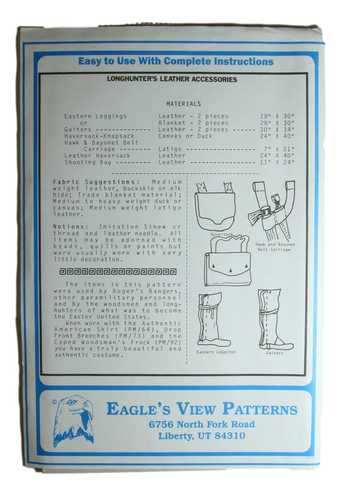 The leather items in this Longhunter Leather Accessories Pattern were all used by Roger's Rangers, other para-military personnel and by the woodsmen and longhunter's of what was to become the Eastern United States.